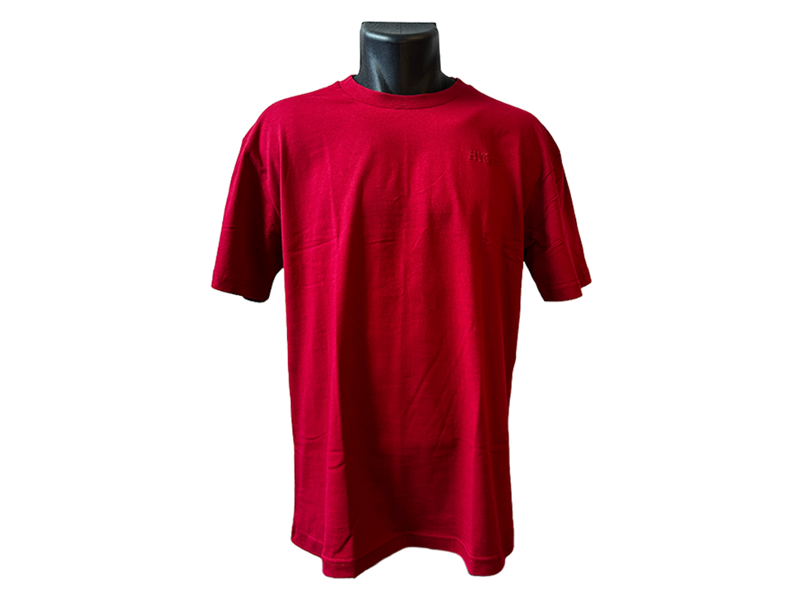 Rød T-shirt med minimalistisk "Hygge"-brodering i GRS-certificeret bomuld. Et salgbart produkt til detail og turisme med bæredygtige tiltag. Læs mere under "Information".
