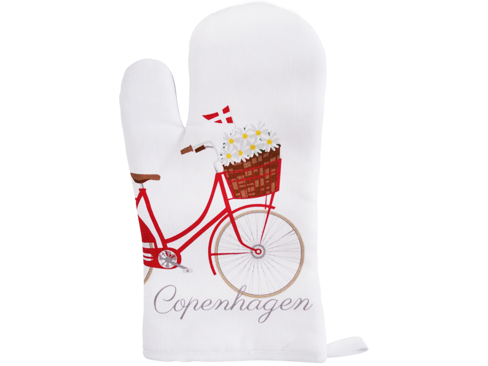 En funktionel og salgsvenlig grillhandske til butikker, der ønsker at tilbyde produkter med tydelig dansk identitet og en højere grad af ansvarlig produktion. Det grafiske cykelmotiv og "Copenhagen"-teksten hylder hovedstadens cykelkultur og urbane livsstil. Handsken er fremstillet i varmeisolerende, slidstærkt og GRS-certificeret materiale – dokumentation for brugen af genanvendte fibre og en mere bæredygtig fremstillingsproces. Perfekt til gavebutikker, turistattraktioner og livsstilsbutikker med nordisk profil.