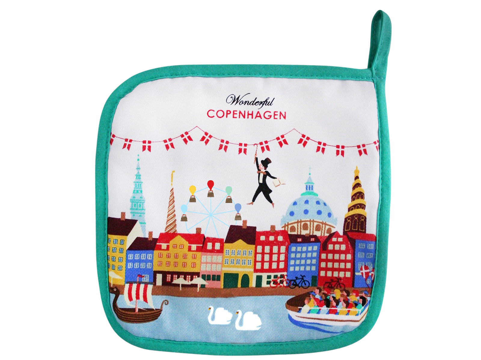 En dekorativ og funktionel grydelap til butikker, der ønsker at tilbyde produkter med stærk kulturel identitet og en mere ansvarlig produktion. Det farverige collage-design hylder H.C. Andersen – Danmarks verdensberømte eventyrdigter – og kombinerer det med ikoniske motiver fra København og Nyhavn. Fremstillet i GRS-certificeret bomuld, som dokumenterer brugen af genanvendte materialer og en mere bæredygtig fremstillingsproces. Et oplagt valg til gavebutikker, museer, turistattraktioner og livsstilsbutikker med fokus på nordisk kultur og design.
