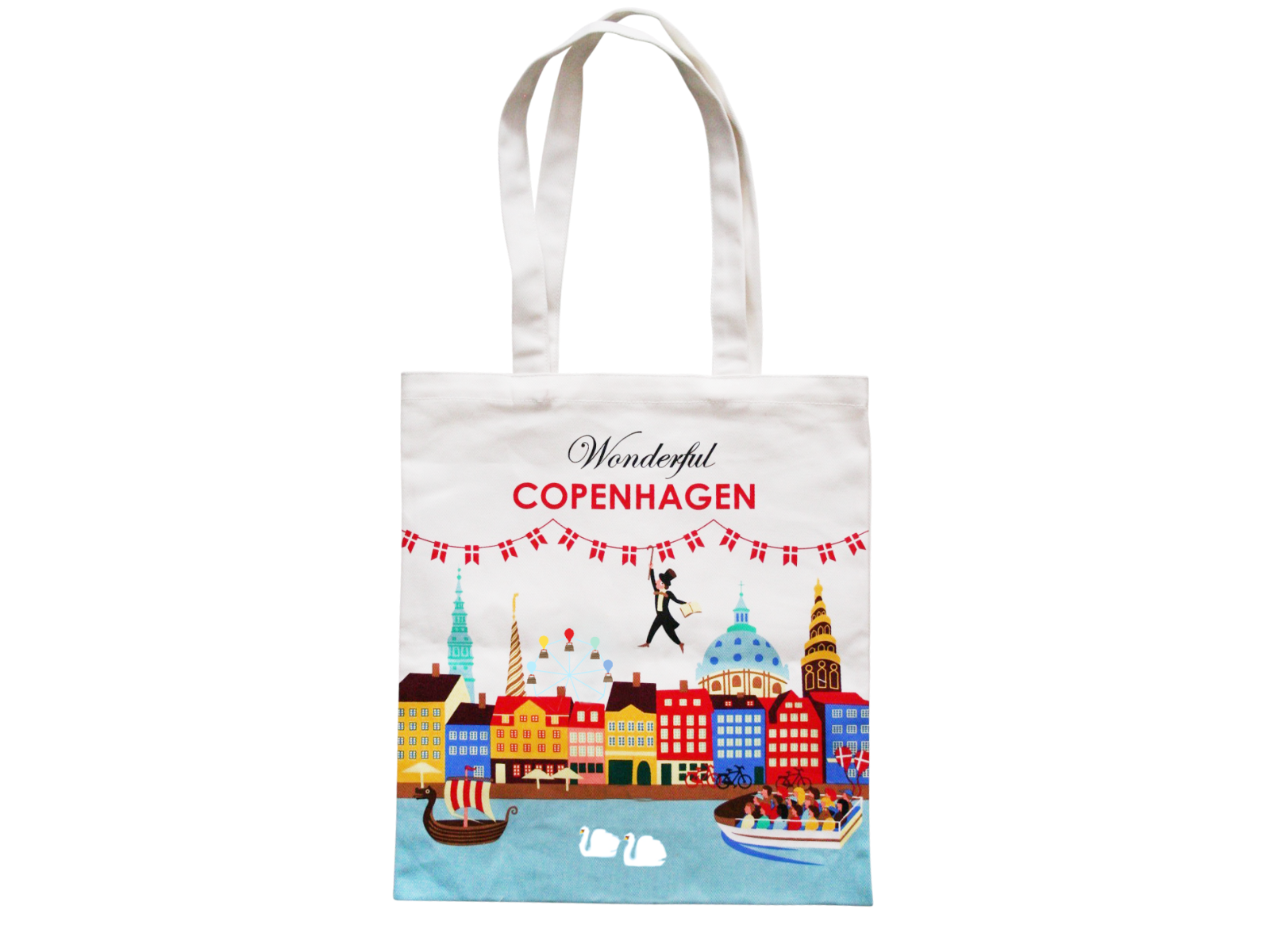 En klassisk og salgsvenlig mulepose til butikker, der ønsker at tilbyde souvenirs med stærk visuel identitet. Det ikoniske "Wonderful Copenhagen"-motiv hylder hovedstadens charme og er et kendt udtryk blandt både turister og lokale. Fremstillet i slidstærk, GRS-certificeret bomuld, hvilket betyder, at det er genanvendt, med lange hanke – ideel til gavebutikker, turistattraktioner og livsstilsbutikker med fokus på dansk design og kulturformidling.